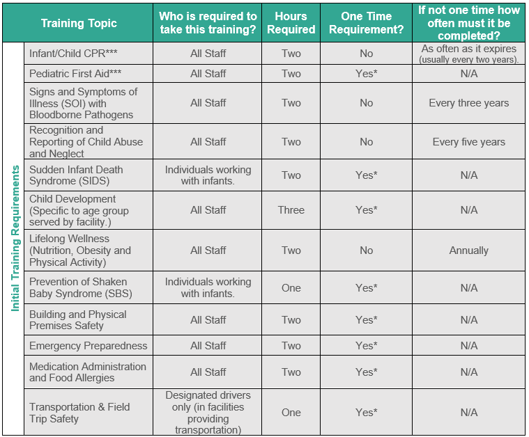 Según las regulaciones de cuidado infantil de Nevada NAC432A SERVICIOS E INSTALACIONES PARA EL CUIDADO DE NIÑOS, todos los cuidadores que trabajen en centros de cuidado infantil con licencia deben completar cursos iniciales específicos de capacitación en cuidado infantil para trabajar con niños pequeños. Estos temas incluyen: RCP, Primeros Auxilios, Signos y Síntomas de Enfermedades con Patógenos Sanguíneos, Reconocimiento y Prevención del Abuso y Negligencia Infantil, Síndrome de Muerte Súbita del Lactante, Desarrollo Infantil, Bienestar de por Vida, Prevención del Síndrome del Bebé Sacudido y Traumatismo Craneal Abusivo, Seguridad de Edificios e Instalaciones Físicas/Almacenamiento de Materiales Peligrosos, Preparación para Emergencias y Planificación de Respuesta, Administración de Medicamentos y Prevención de Alergias Alimentarias, y Seguridad en el Transporte y Excursiones. Toda la capacitación inicial debe completarse dentro de los 90 días posteriores a la contratación*.